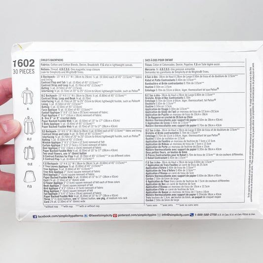 Simplicity 1602 Sewing Pattern - Child's Backpacks