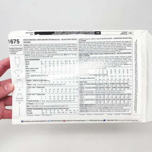 Simplicity 1675 Sewing Pattern - Child's and Girls' Skirts and Knit Top and Bolero