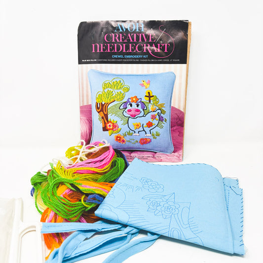 Avon Creative Needlecraft Blue Moo Pillow Crewel Embroidery Kit