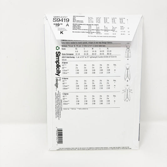Simplicity Sewing Pattern - Apron - S9419 - Size XS-XL