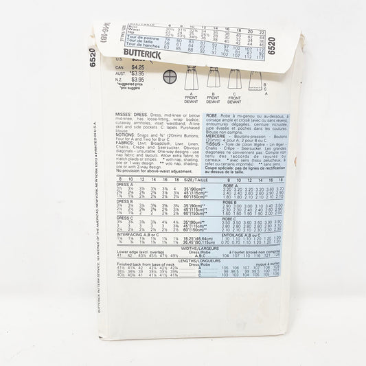 Vintage 1980s Butterick Dress - 6520 - Size 14-18