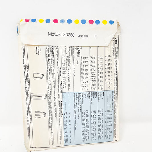 Vintage 1982 McCalls Bottoms - 7856 - Size 18