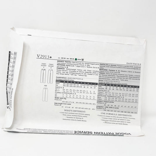 2007 Vogue V2913 Sewing Pattern - Pants - 0SZ