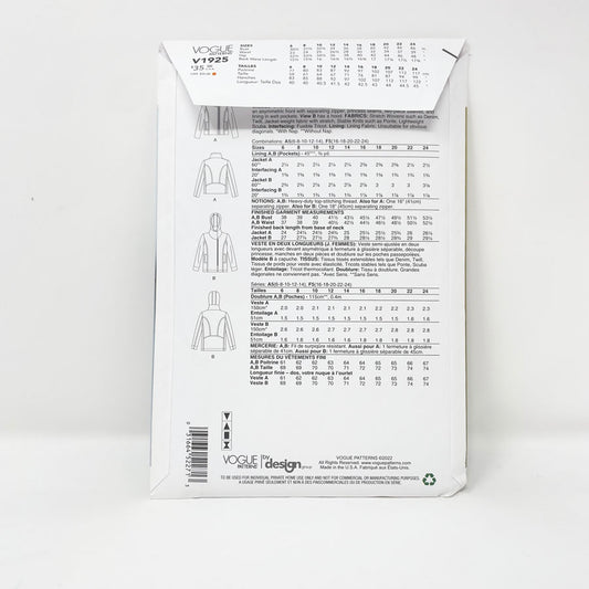2022 Vogue Marcy Tilton V1925 Sewing Pattern - Jacket - 6-14