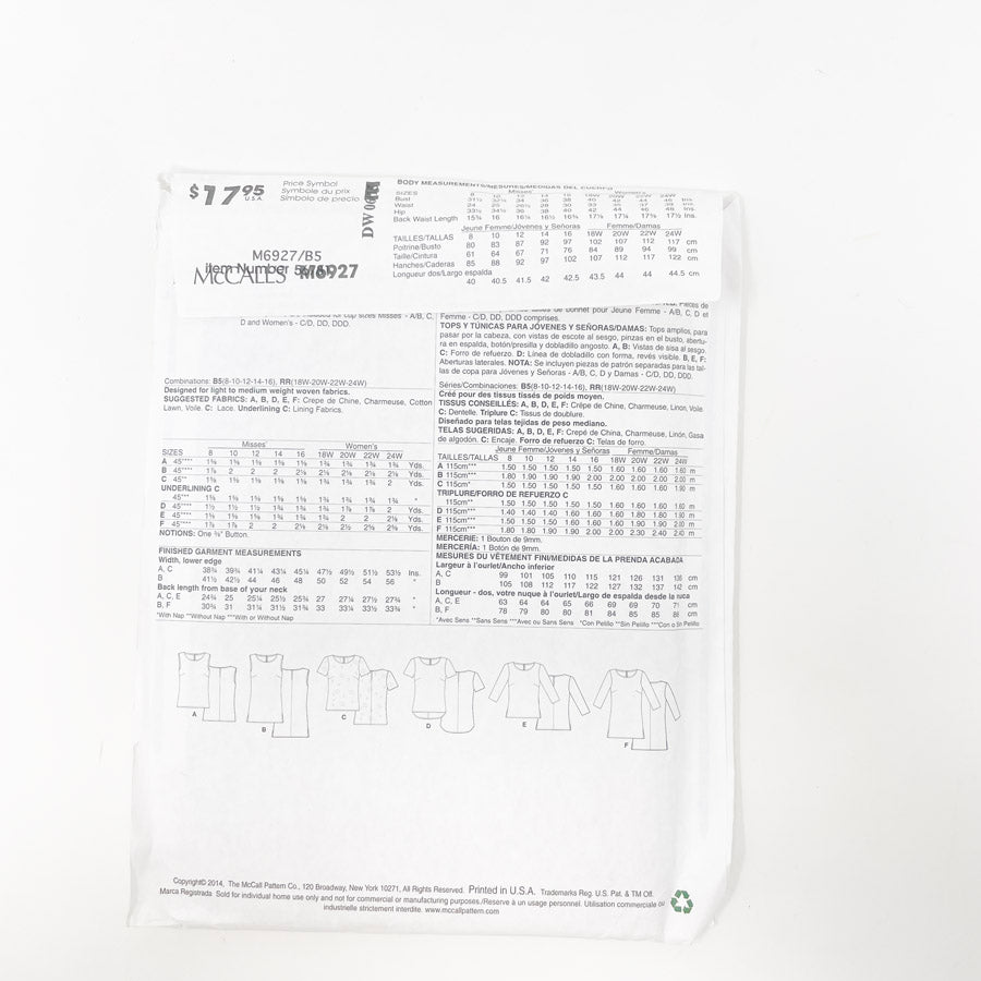2014- McCall's- M6927- Tops and Tunics- Tall sizes 8-16