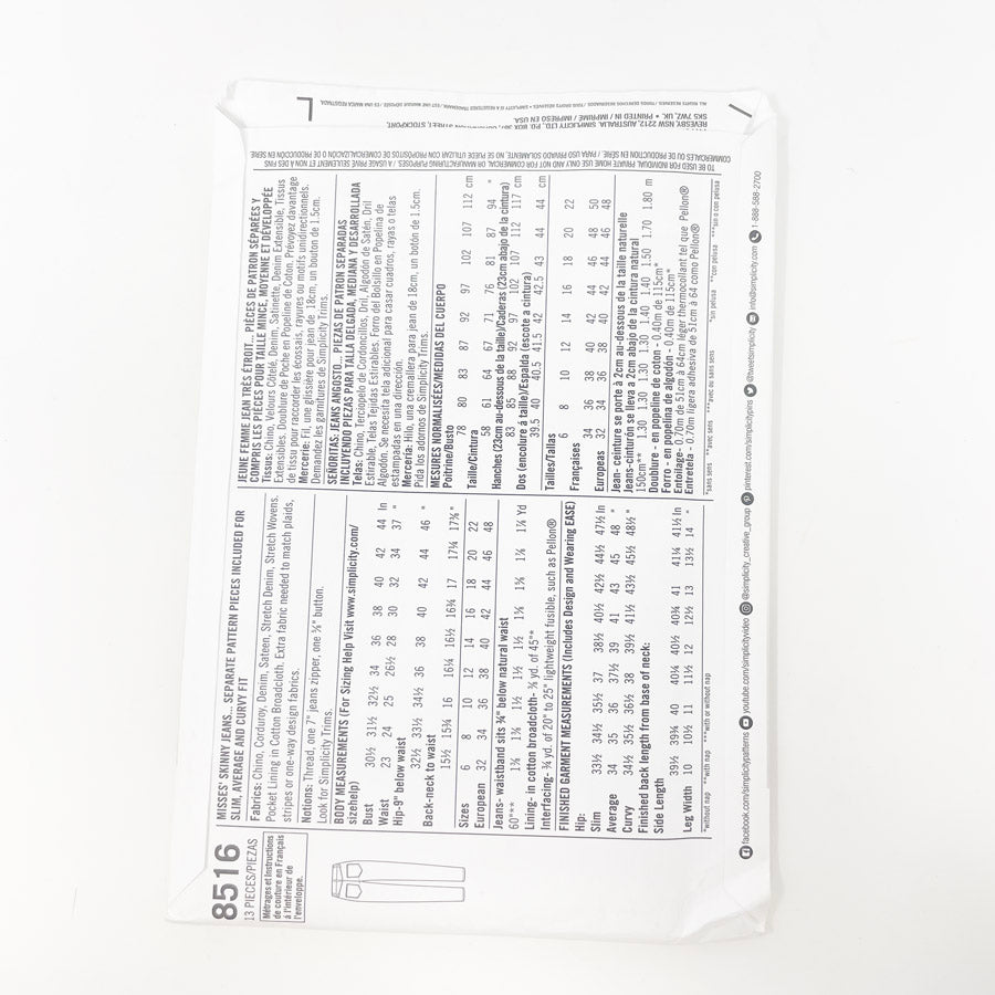 2017- Simplicity- 8516- Skinny Jeans- Size 6-14