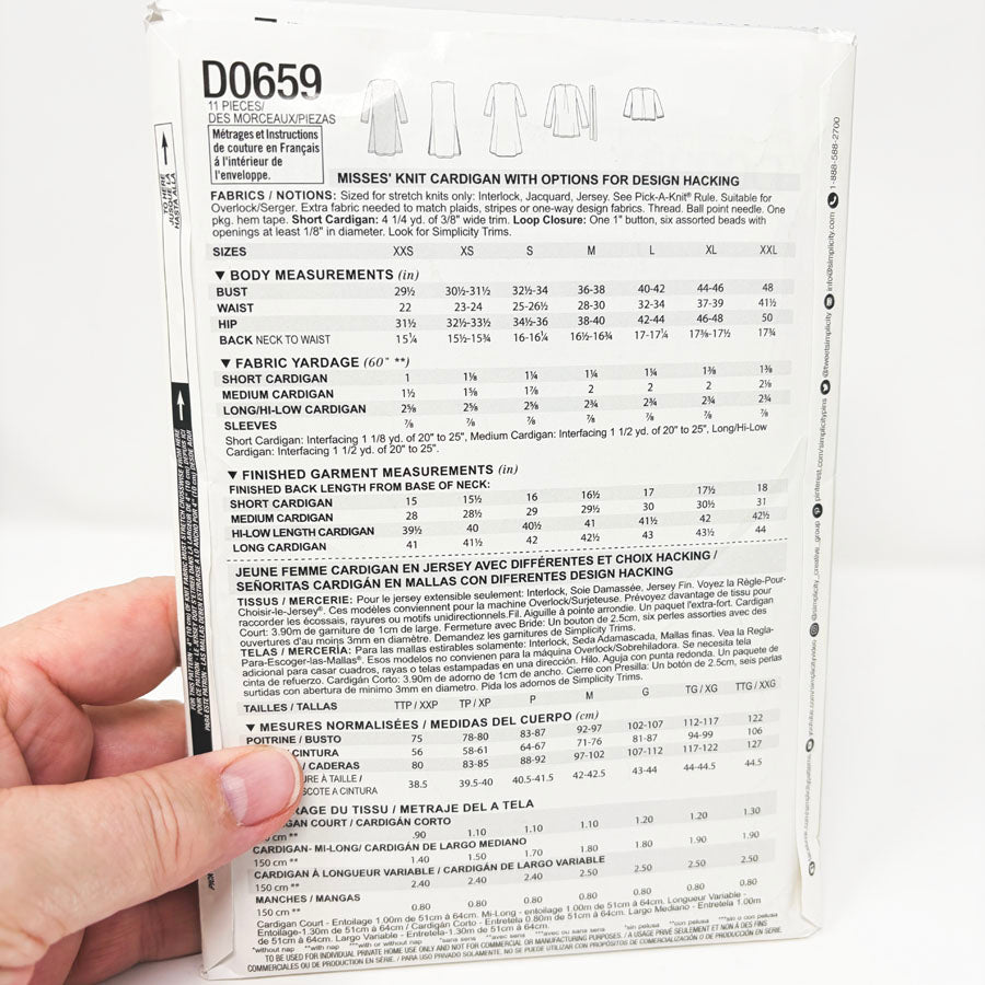 2017 Simplicity Sewing Pattern - Cardigan - D0659 - Size XXS-XXL