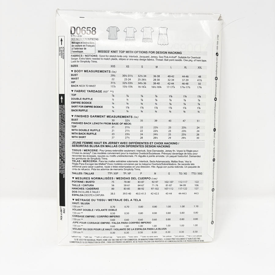 2017 Simplicity Sewing Pattern - Top - D0658 - Size XXS-XXL