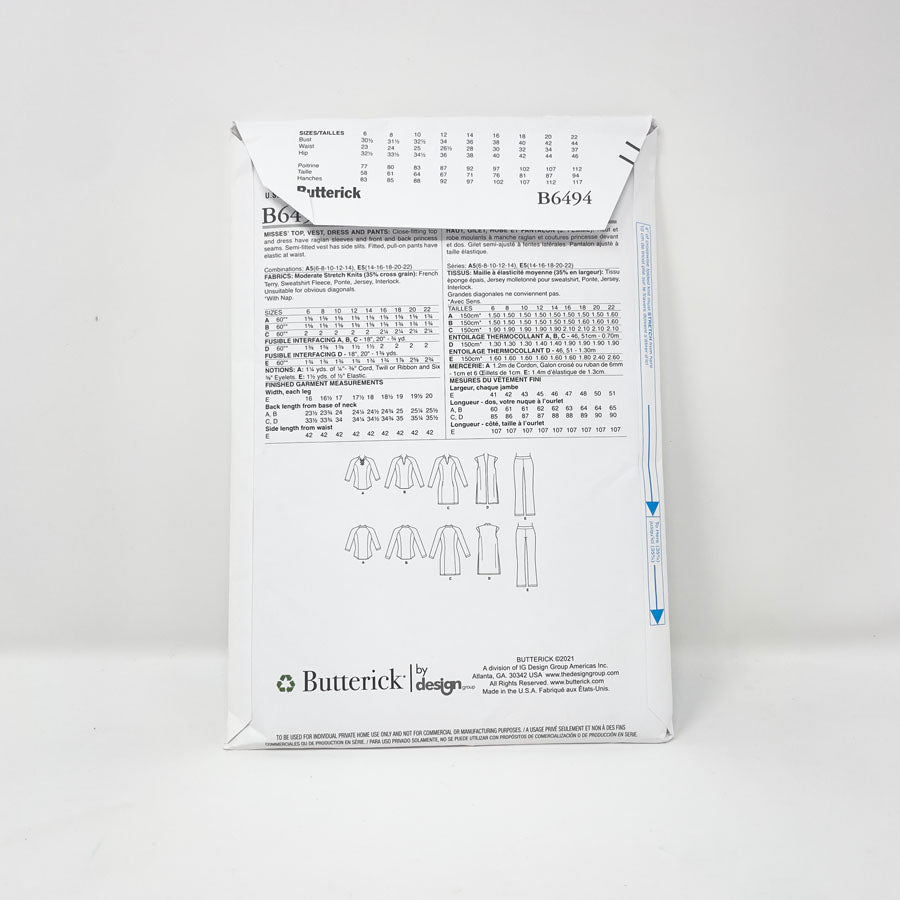 2021 Butterick Sewing Patterns B6494 - Misses Top Vest Dress and Pants