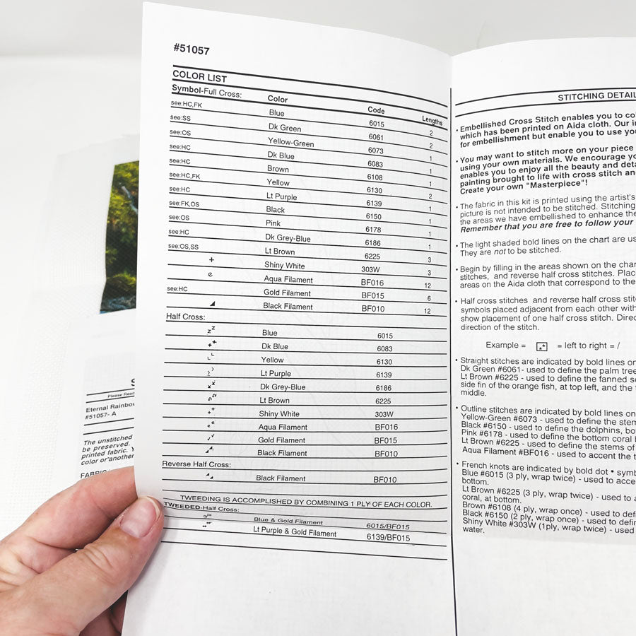 The color printed aida, instructions with thread color code, and pattern details are included. There is no floss.