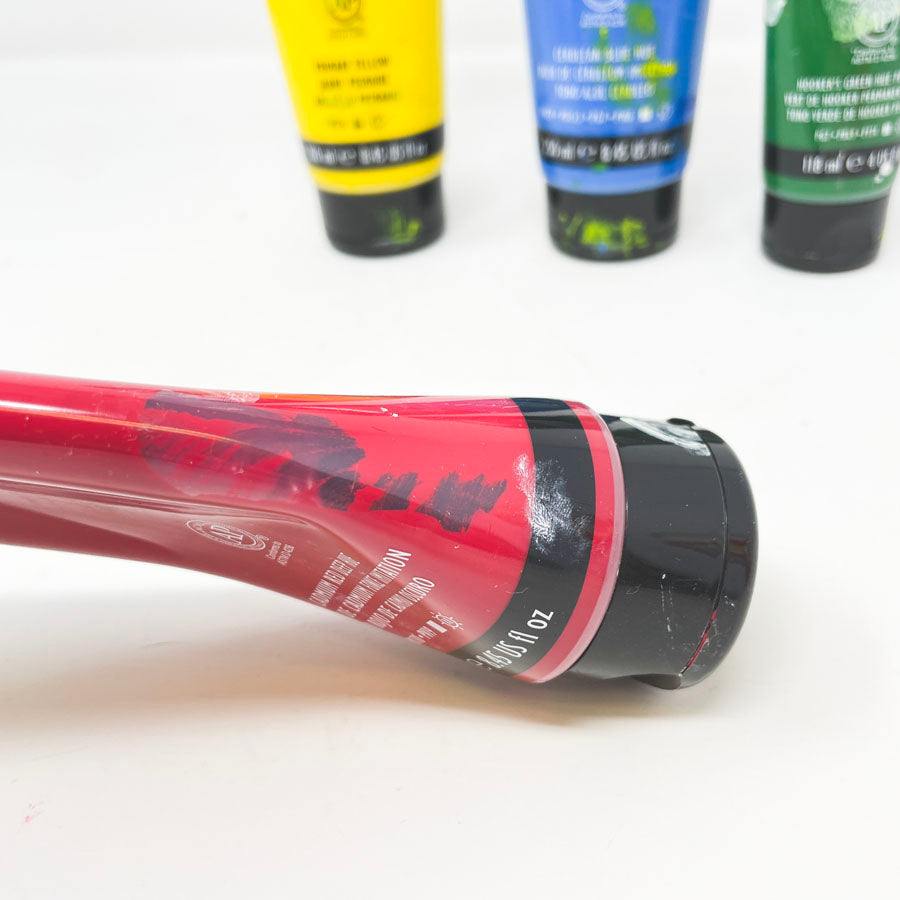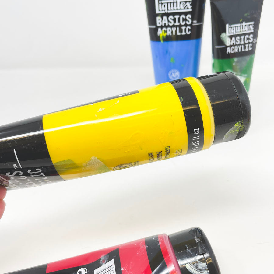 Secondhand partial tubes. Yellow and green are over half full, blue and red are under half full.