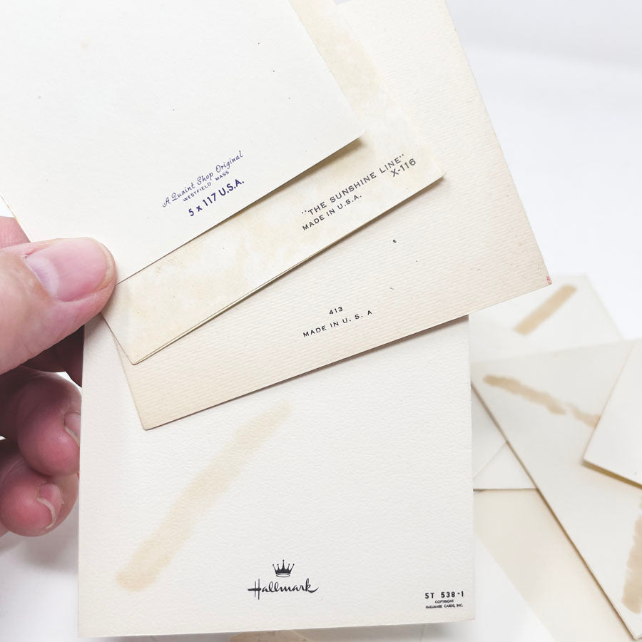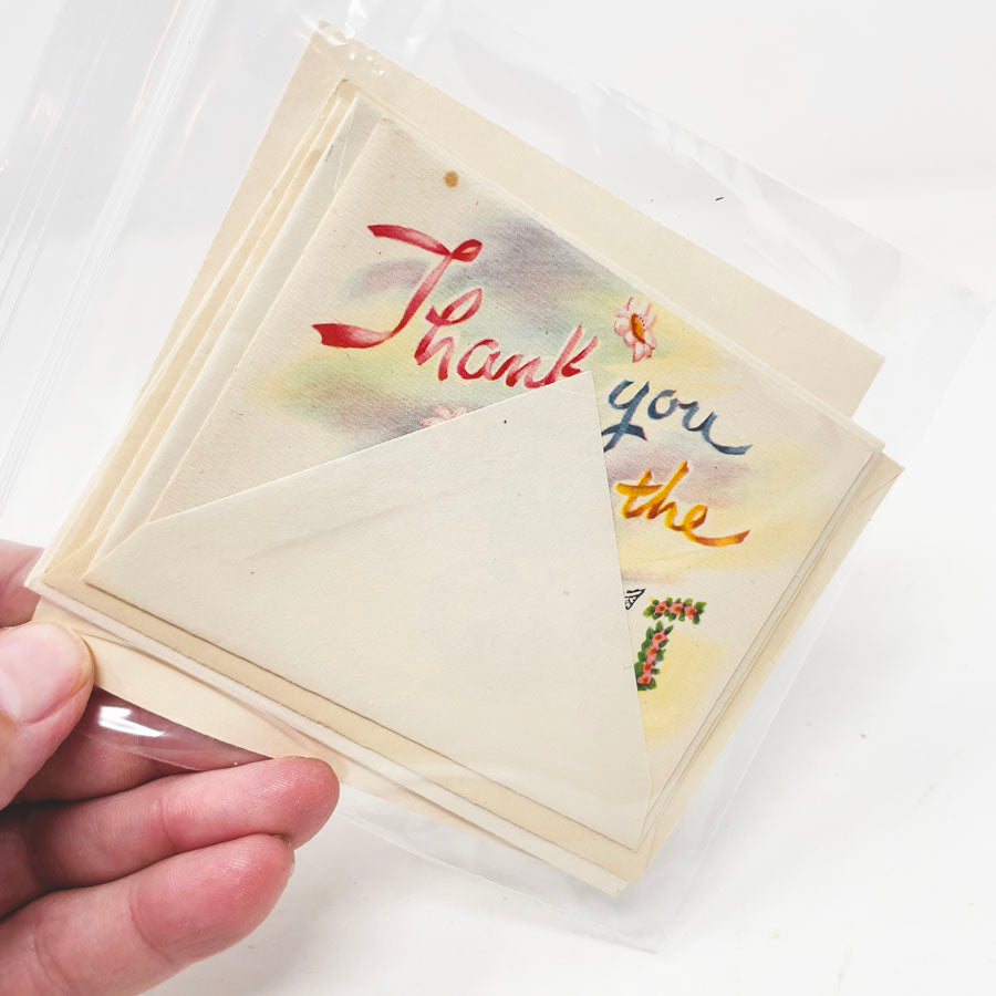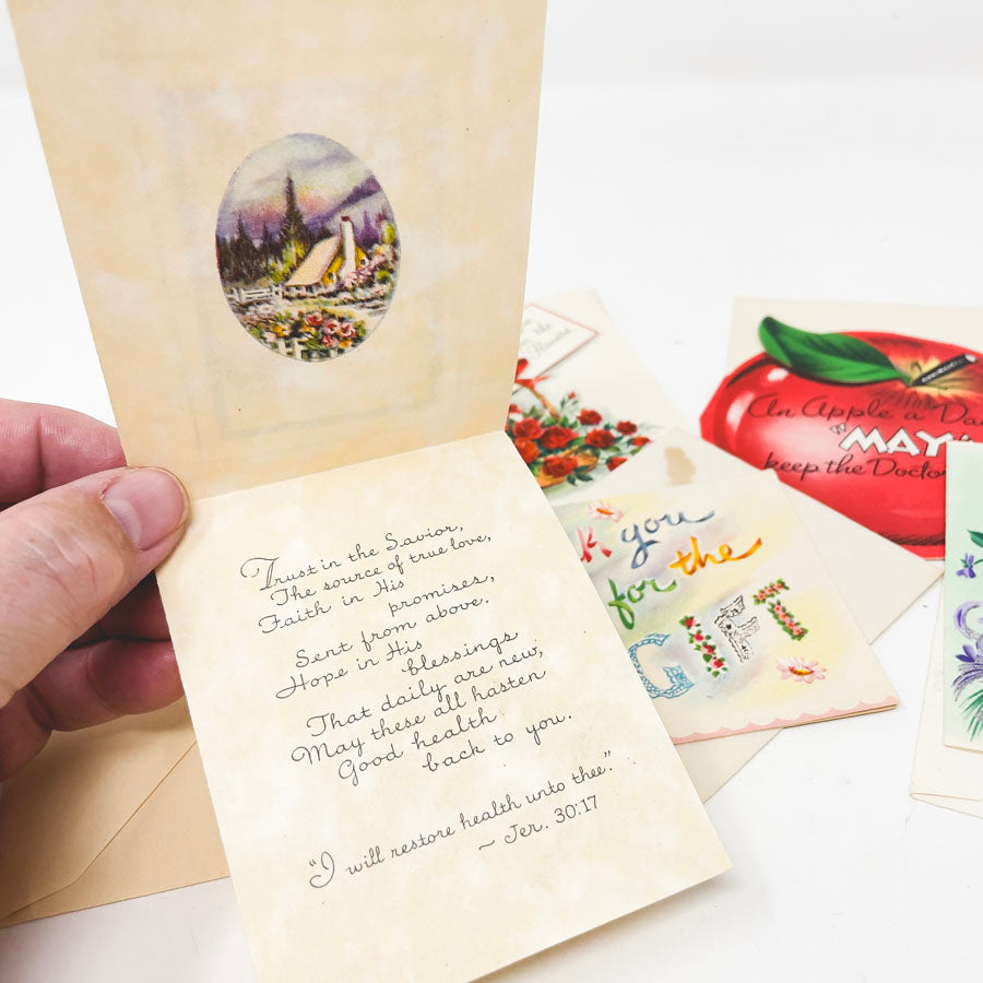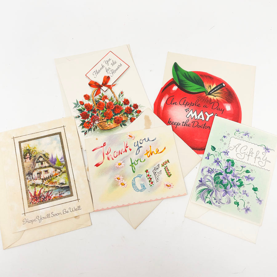 Bundle of 5 assorted vintage greeting cards with original envelopes. Includes “Get Well,” “Thank You,” and “Gift” themes. Makers include Hallmark, Gibson, Sunshine Line, and others. Envelopes show typical age toning and glue marks, cards are in nice vintage condition. These cards have no writing in them.
