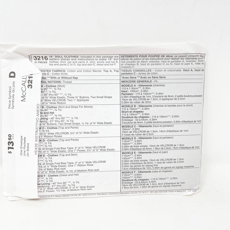 McCall's 3216 Sewing Pattern - 18" Doll Clothing