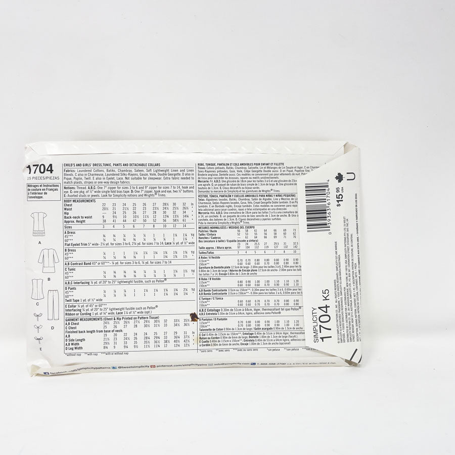 Simplicity 1704 Sewing Pattern Kids Dress/Tunic with Collar and Pants