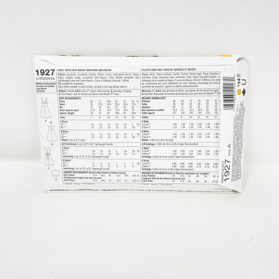 Simplicity 1927 Sewing Pattern - Children's Dress - Sizes 7-16