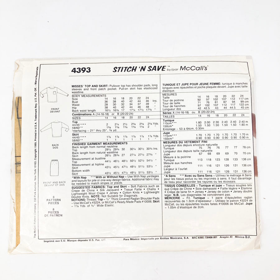 McCall's Stitch 'N Save 4393 Sewing Pattern - Outfit (14-18) - 1989