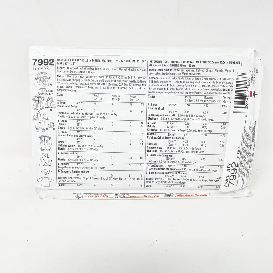 Simplicity 7992 Sewing Pattern - Baby Doll Clothing