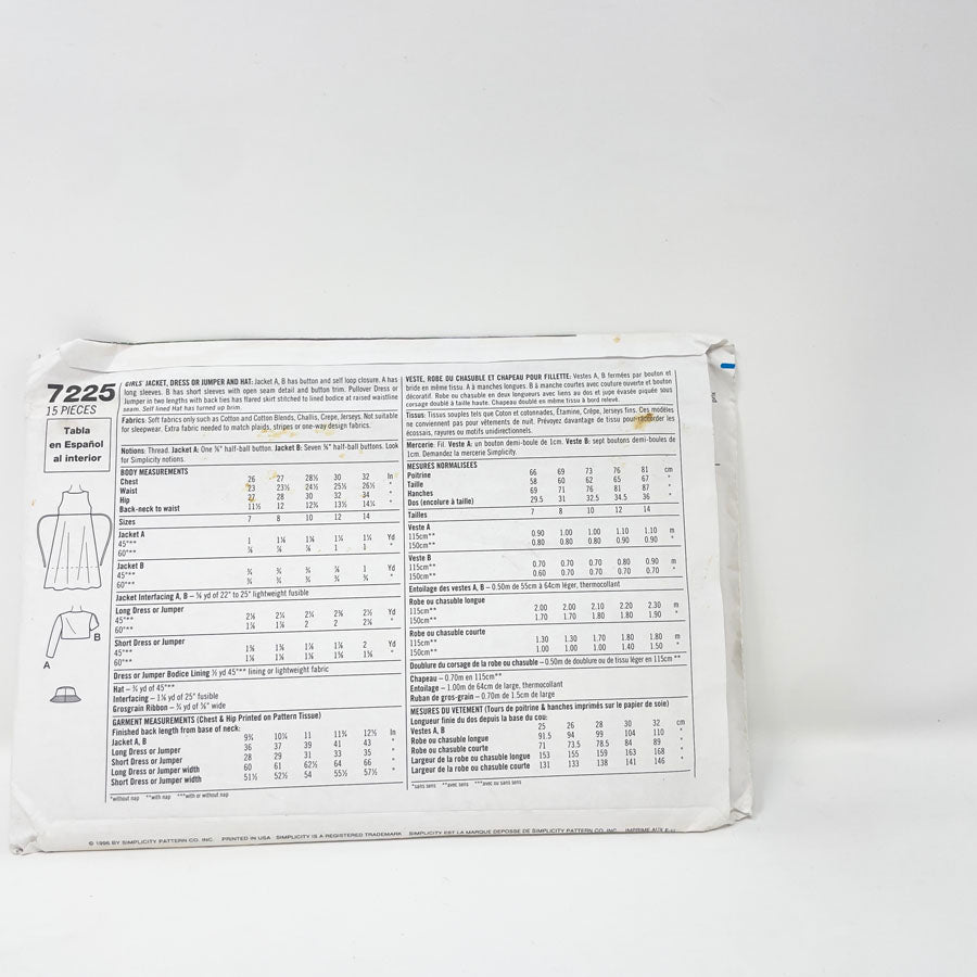 1996 Simplicity Sewing Patterns 7225 - Girls jacket Dres or Jumper and Hat